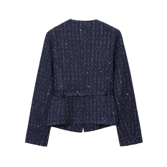 Damen Glitzer-Tweed-Blazer | Kurz mit Rundhals & Taillengürtel | Marineblau